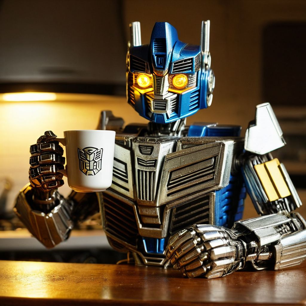 transformers generation 1,1980s retro robot, drinking from cup of tea, made of cast-iron, TransformersStyle, ((wide focus)), flashing lights