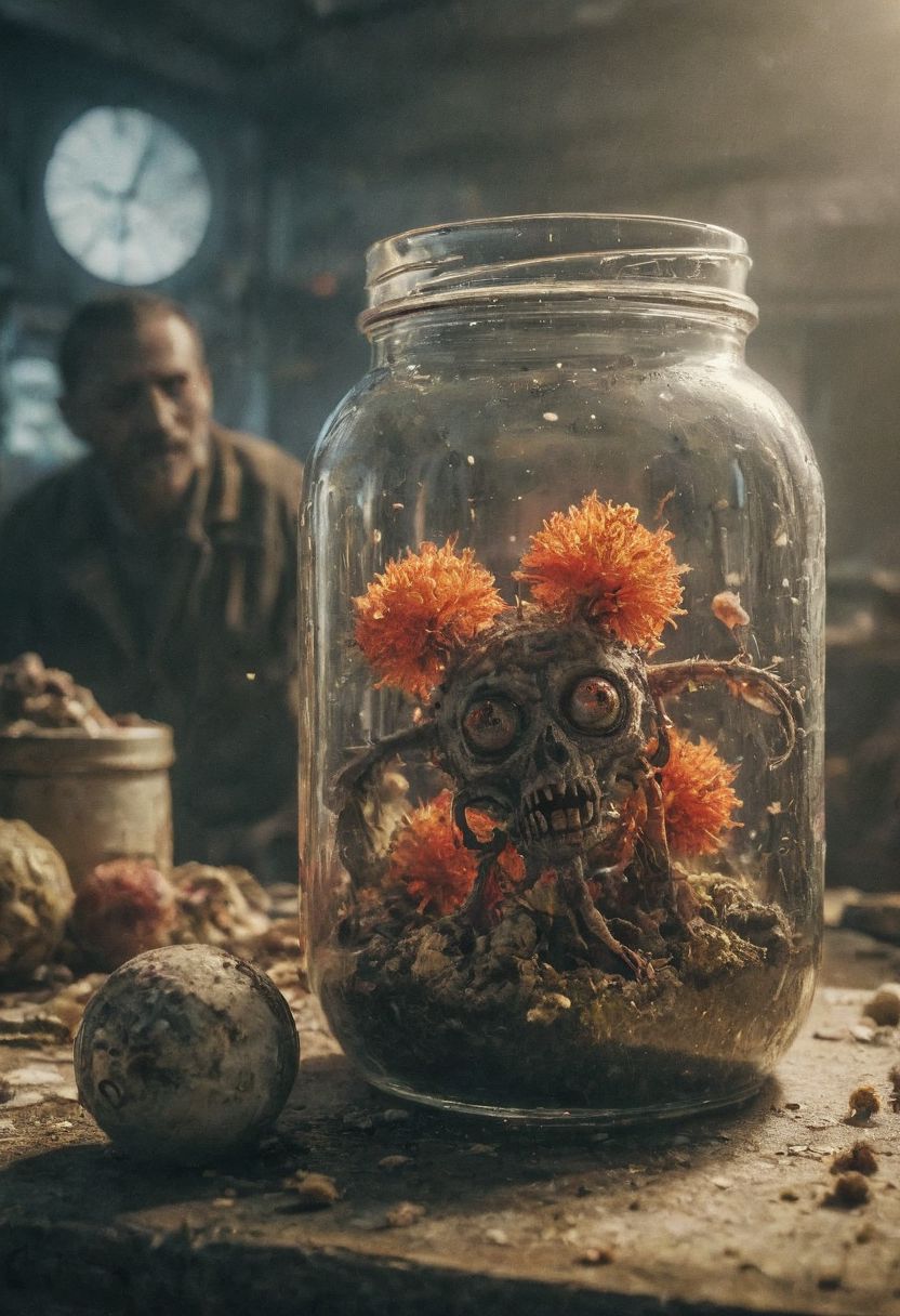 (a jar with an organic virus, laboratory biohazard in the background). As the aids hiv virus mutated with covid, it created a new zombie virus similar to the T-virus. This new virus, called the C-virus, makes people like gore, clowns, colorful things, aliens, feminization and vampire demons, etc. This makes people believe that cosmic horrors are real, however, they are just zombies of consumerism, resident evil in the style of David Cronenberg. Wide range of colors., Dramatic,Dynamic,Cinematic,Sharp details Insane quality. Insane resolution. Insane details. Masterpiece. 32k resolution. <lora:add-detail-xl:0.95> <lora:dvr-lnds-sdxl:0.3> dvr-lnds-sdxl <lora:MJ52:0.25> <lora:ral-apoctvisn-sdxl:0.3> ral-apoctvisn <lora:zavy-cntrst-sdxl:0.35> dark, chiaroscuro, low-key <lora:zavy-rmlght-sdxl:0.41> zavy-rmlght <lora:SDXLFaeTastic2400:0.225>