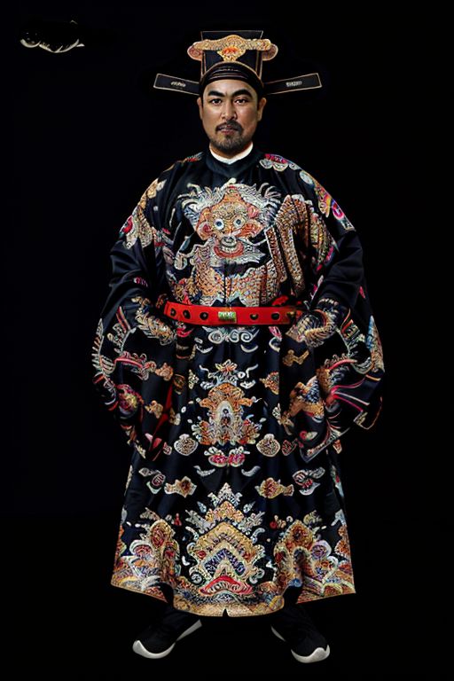 Vietnamese old man,long beard,facial hair,Vietnam court official, black clothing, standing
