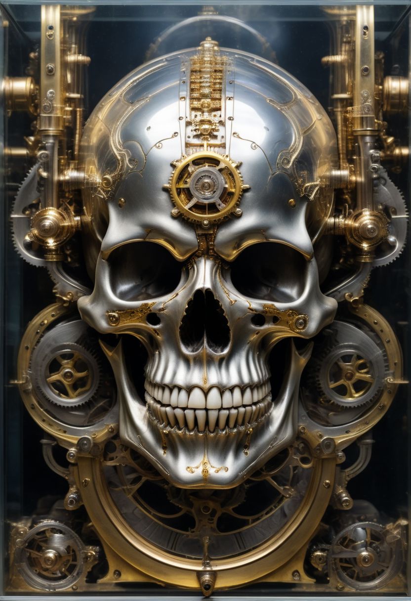 high-quality, ultra-detailed, image of (a human skull, inlaid with gold and silver, with pronounced cheekbones and sharp teeth. It is an artifact from an ancient newly discovered society. It is ceremonial in nature. It is in a steampunk style mechanical and glass capsule that allows it to be displayed at a steampunk museum, the mechanism of locks of the display case should be steampunk in style, while the skull is more ancient cyberpunk), best quality, masterpiece, masterful composition, award, extremely detailed, incredibly high resolution, 32k, 16k, 8k, 4k, UHD, HDR, hyper-realistic, photo studio quality, amazing clarity, tack sharp, sharp focus, volumetric lighting, morning light, cinematic style, H.R. Giger, intricate details, terminator, metric, patina, gunmetal, brass, veneer, chrome
