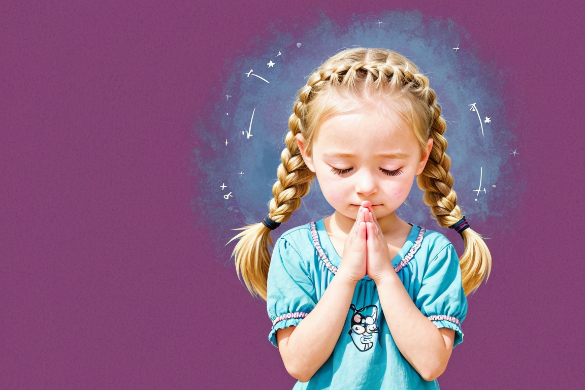 a cute little girl, braids and blond hair, closed eyes, praying, cartoon traits, faith, religion, (VISIBLE HANDS PRAYING), perfect hands, (generic and abstract background, noise), anime, design, bright, incredible, <lora:detailed_notrigger:1.5>