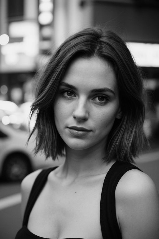 1 girl, (30 years old slim girl with verty short blonde hair),(beautiful face,exquisite face,skin texture:1.2), black shirt, upper body portrait, (ultra-wide angle:1.3), from front, watching away, pale skin, (masterpiece,best quality,ultra high res:1.2),(photo-realistic:1.3),tokyo street at dusk, rim lightinig, dimly lit, kodak tri-x 320, faded