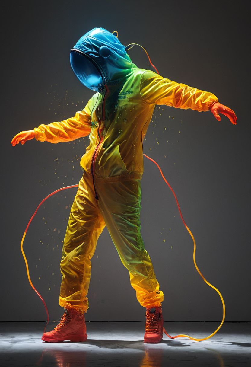 amazing quality, masterpiece, best quality, hyper detailed, ultra detailed, UHD, dof, hyper-realism, majestic, awesome, inspiring, a dancing Woman in Pop-Art spray Style colorful hazmat suit designed By Keith haring, cables and translucent hoses, wires Made of plastic, cinematic composition, soft shadows, national geographic style, cozy light, cinematic lighting, volumetric lighting, Film grain, cinematic film still, shallow depth of field, highly detailed