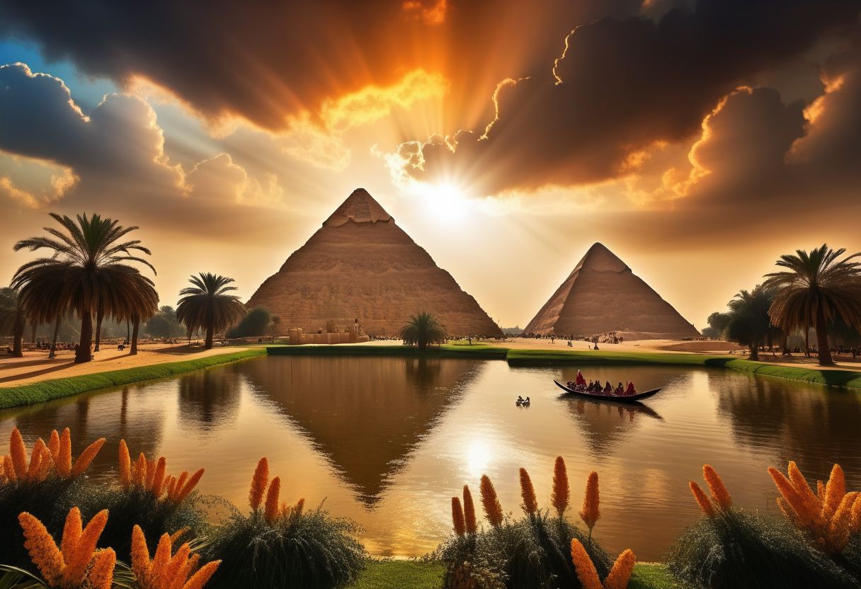 cinematic photo of [[[Khufu ship]]] sailing on small lake beside magnificent three pyramids of Giza appear clearly, ducks and geese swimming, papyrus plants, charm, Professional lighting, full of life, Lively and energetic, 8K, rays of sun flow beyond heavy clouds, HDR, Cinematic Shot, Cinematic Lighting, amazing world, pure perfection, wide angle exterior background, autumn leaves, grass, flowers, jasmine flowers, palm trees, nebula horizon.