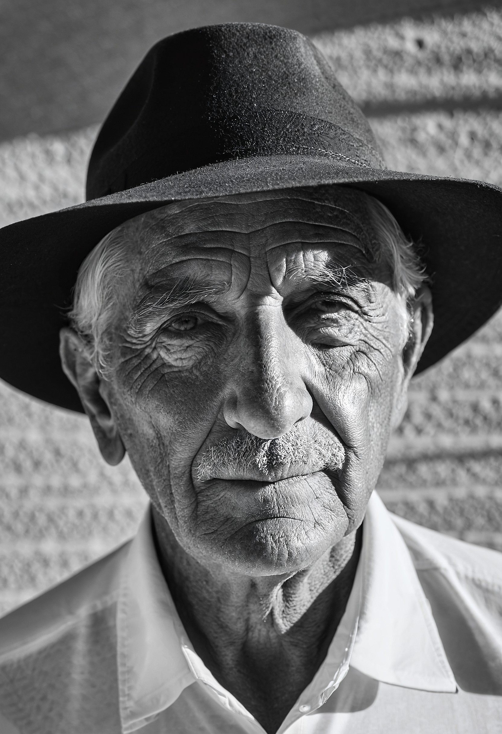 B&W headshot, a 75yo italian man, light filtering through a hat's brim, casting intricate shadows on the face