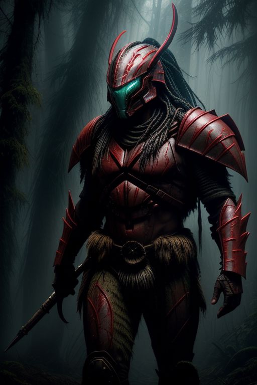 Amazing scene of Predator, fully armored Yautja, badass helmet with war paint, misty forest setting, dimly lit, epic lighting, predator has advances technological rocket-launch system deployed from his shoulder armor, highest quality, focused, clear,