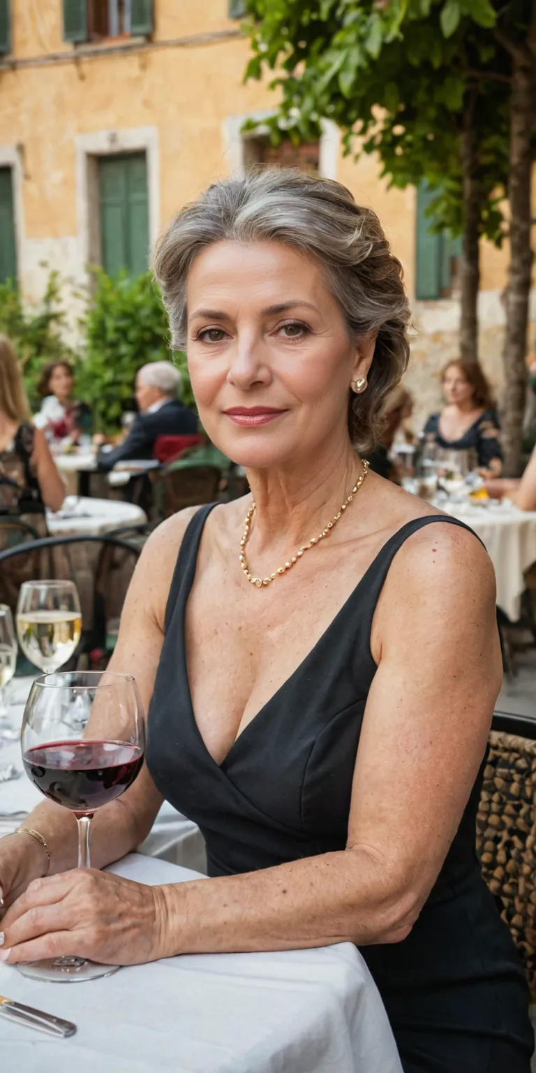high society elite upper class mature European woman sitting at italian outdoors restaurant table