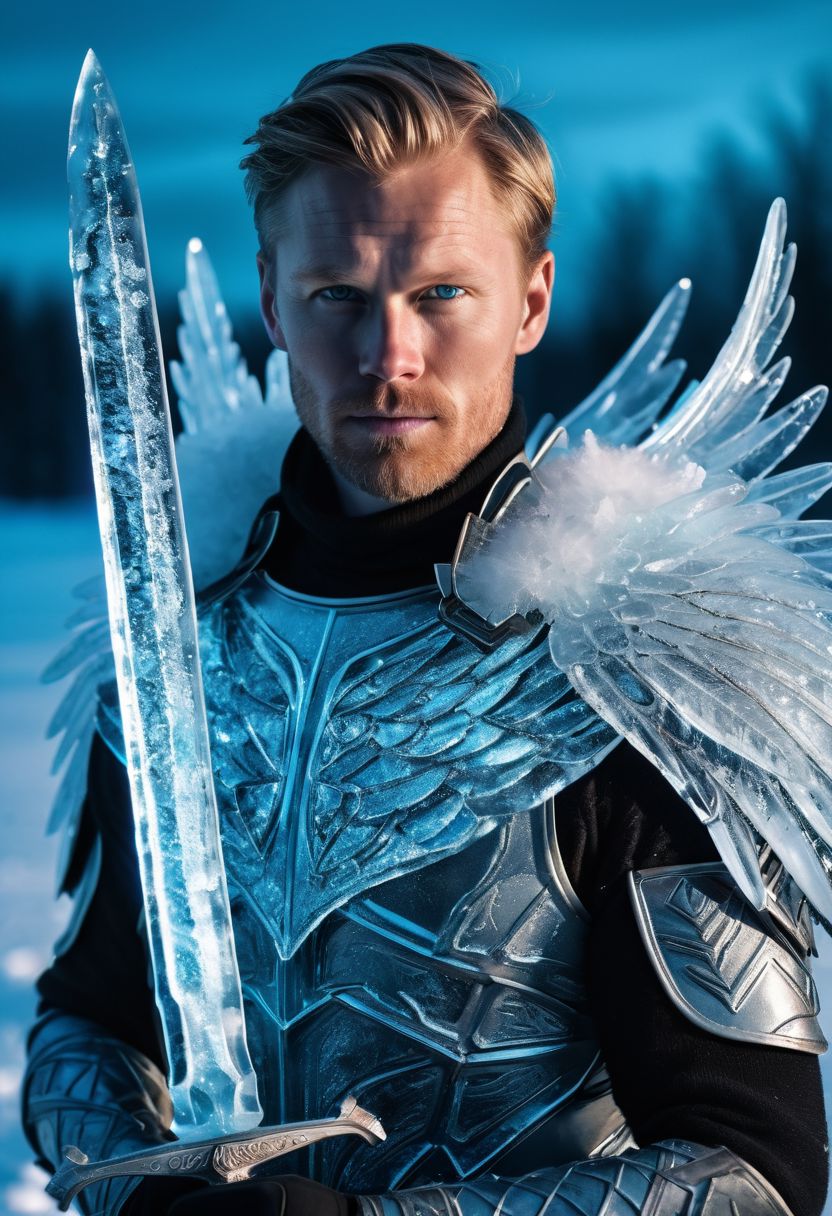 photo of 35 y.o handsome Scandinavian man, short hair, upper body, mask of translucent ice covering half of his face, detailed face, icy blue eyes, wings of ice, holding large ice sword, dynamic pose, clothes of ice, looking at viewer, ice armor, aurora borealis, high quality, sharp focus, cinematic shot, dramatic lighting