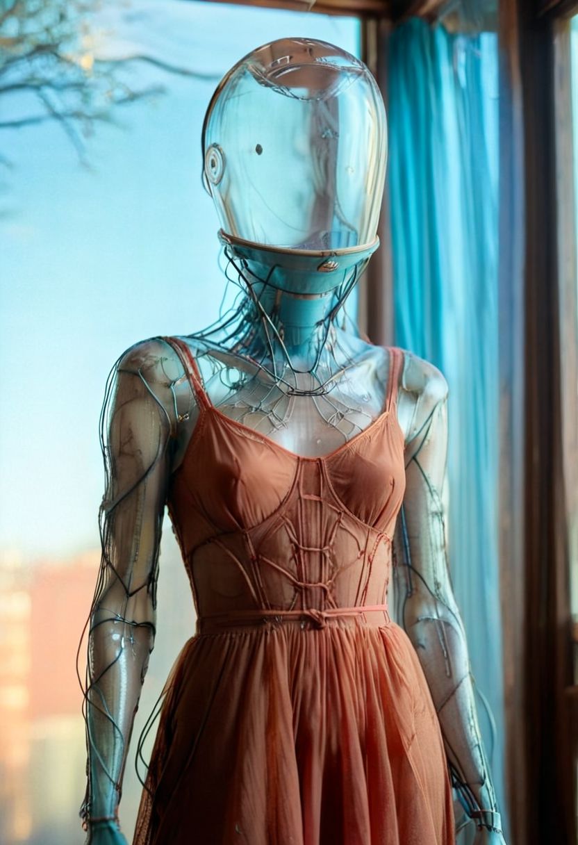 Create an image of an female Slender translucent dark-red skinned female, Long billowing dress Made of cables and hoses, standing at a corner, peeking out curiously. It is wearing a vintage see through summer dress. The colors of the image should be vibrant translucent blue like water, but still giving it a vintage look. The background is a downtown area on a sunny morning, with birds visible in the scene. volumetric lighting, atmospheric haze, Film grain, cinematic film still, shallow depth of field, highly detailed, high budget, cinemascope, moody, epic, OverallDetail, gorgeous, 2000s vintage RAW photo, photorealistic, candid camera, color graded cinematic, atmospheric lighting, skin pores, imperfections, natural, shallow dof,
