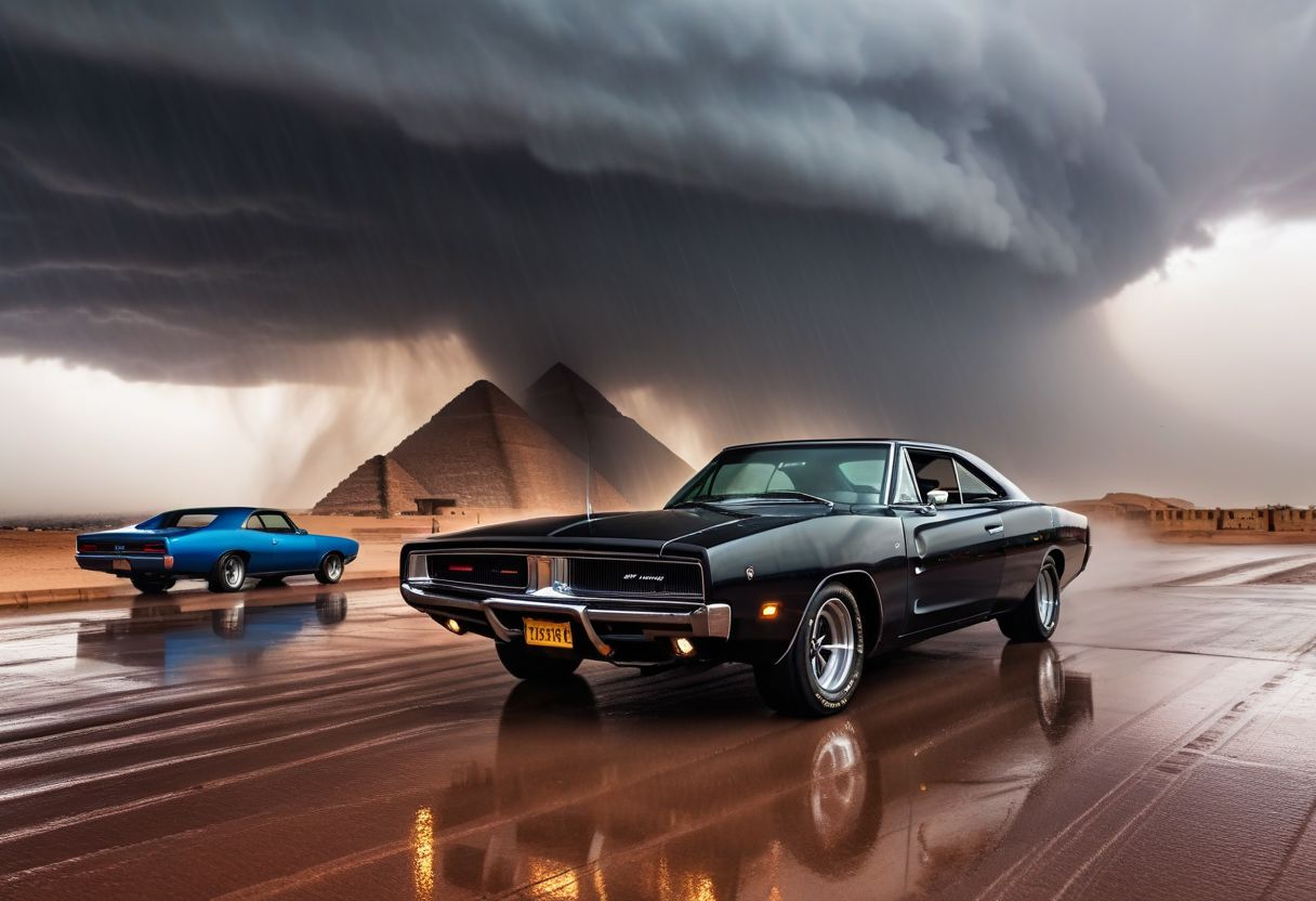 cinematic photo of dodge Charger 1968 and the [[[three pyramids of Giza]]] in the background, charm, highly detailed car, Professional lighting, rain, wet road, 8K, rays of sun flow beyond heavy clouds, HDR, Fast & Furious movie, motion blur, moving tires, Cinematic Shot, Cinematic Lighting, amazing world, pure perfection, Need For Speed, wide angle exterior background
