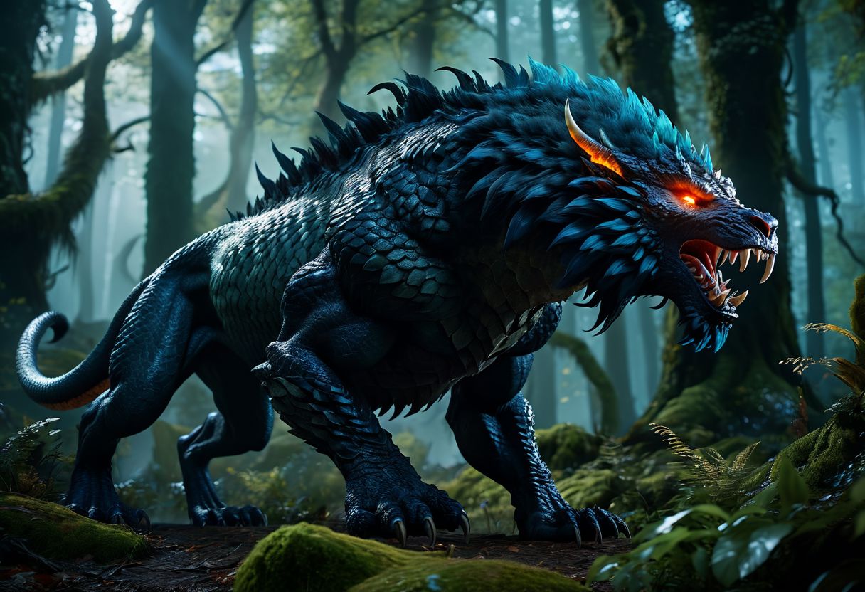 Giant wicked Chimera roaring fiercely in a mystical forest setting, hyper-realistic, UHD, creature design, fantasy, detailed fur and scales, epic lighting, dynamic composition, 8k resolution