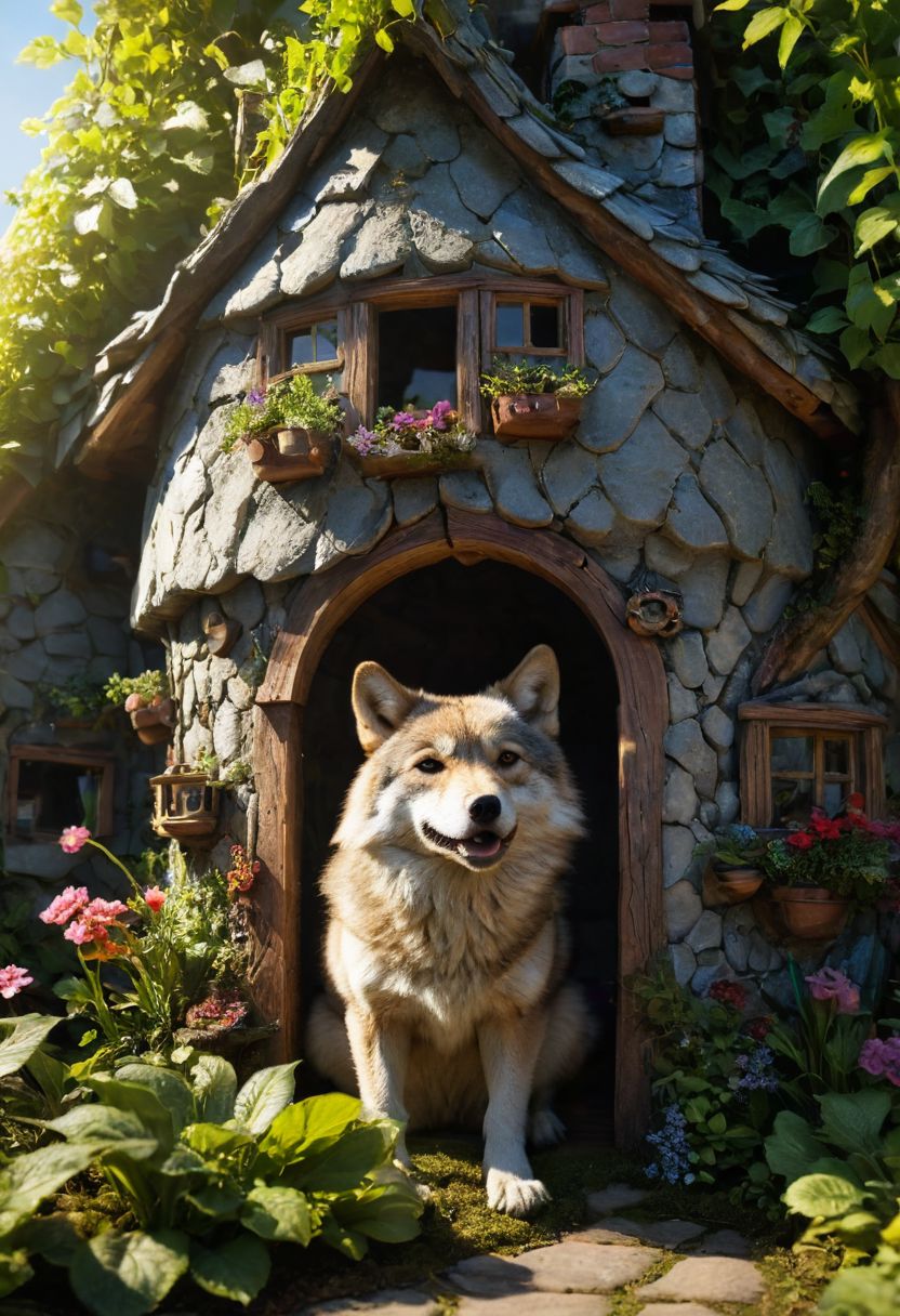 amazing quality, masterpiece, best quality, hyper detailed, ultra detailed, UHD, perfect anatomy, dof, portrait, awesome, inspiring, Expressiveh, realistic, high quality, 4K, absurd resolution, incredibly detailed, masterpiece, sharp, cute wolf house garden, cute, happy, extremely detailed, no humans, extremely detailed scales, sunlight, realistic, high quality, detailed, shadows, glowing, bright colors, high contrast, vivd lighting, cinematic composition, soft shadows, national geographic style,