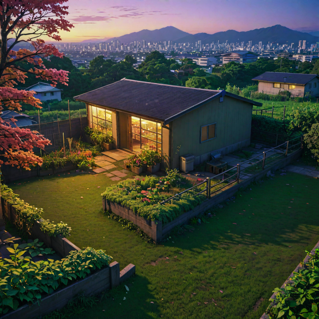 anime key visual, masterpiece, landscape of a Sturdy Overgrown (Stable:1.3) from inside of a Cabin, warm foliage and cityscape, at Sunrise, detailed, masterpiece, Flustered, Synthwave Art, Nostalgic lighting, L USM, Cold Colors, opulent, Orton effect,"We belong together, you're mine and we belong together.", dslr, octane engine, (art by Kazuki Takamatsu:1.3) , (Rumiko Takahashi:0.9) , (Hikari Shimoda:1.3) , (Takashi Murakami:0.9)
