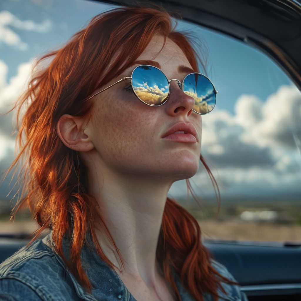 breathtaking,hyperrealistic art portrait of a young woman with red hair wearing round glasses,a blue sky and clouds reflecting in her sunglasses in the style of Craig Mullins,a hyperrealistic portrait,fine details,extremely high-resolution details,photographic,realism pushed to extreme,fine texture,incredibly lifelike,award-winning,professional,highly detailed,, ultra quality, ultra detailed, intricate details, 8k, hdr, octane, masterpiece