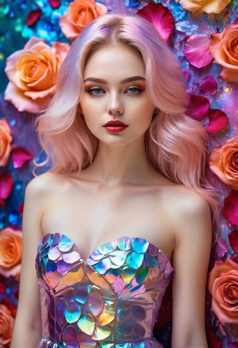 imagine standing-up portrait in ((style vivid iridescent saturated paint)) of beautiful 22yo made through surface of pristine crystal . divine beauty, most attractive in the world 1girl color. rare rose petals ,pale skin