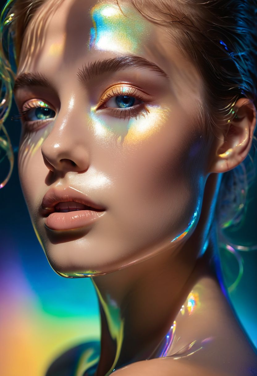 imagine naked 22yo walking toward camera through iridescent liquid glass as if glass would be liquid, extremely detailed, ultra-detailed, volumetric shadow, perfect facial details and perfect body line, backlit eyes, inner light, radiates light