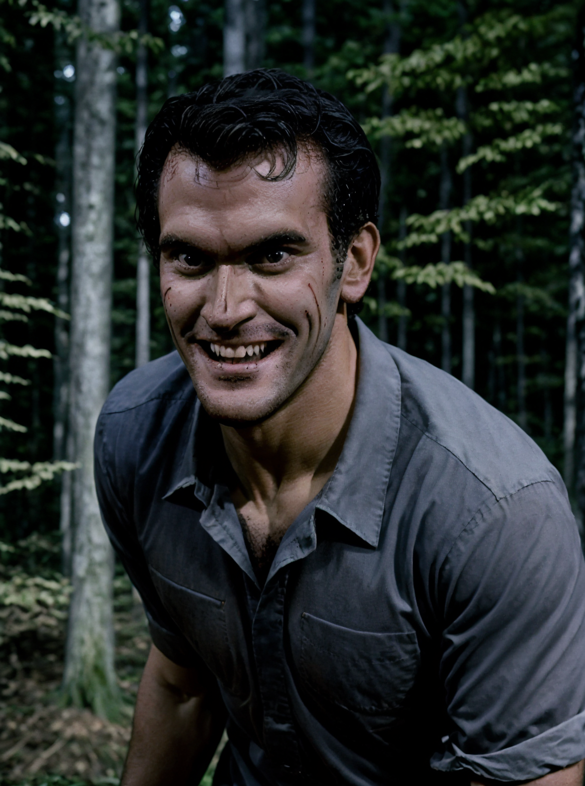 badash, human, evil smile, upper body, blue shirt, dark forest background <lora:Ash_Williams_Evil_Dead__Army_of_Darkness:0.9>