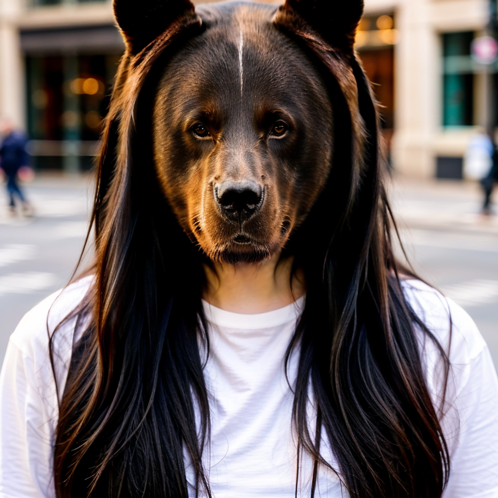 a woman with long black hair <lora:bear_300steps:2.3>, 8k, 4k, in street, headshot, white shirt