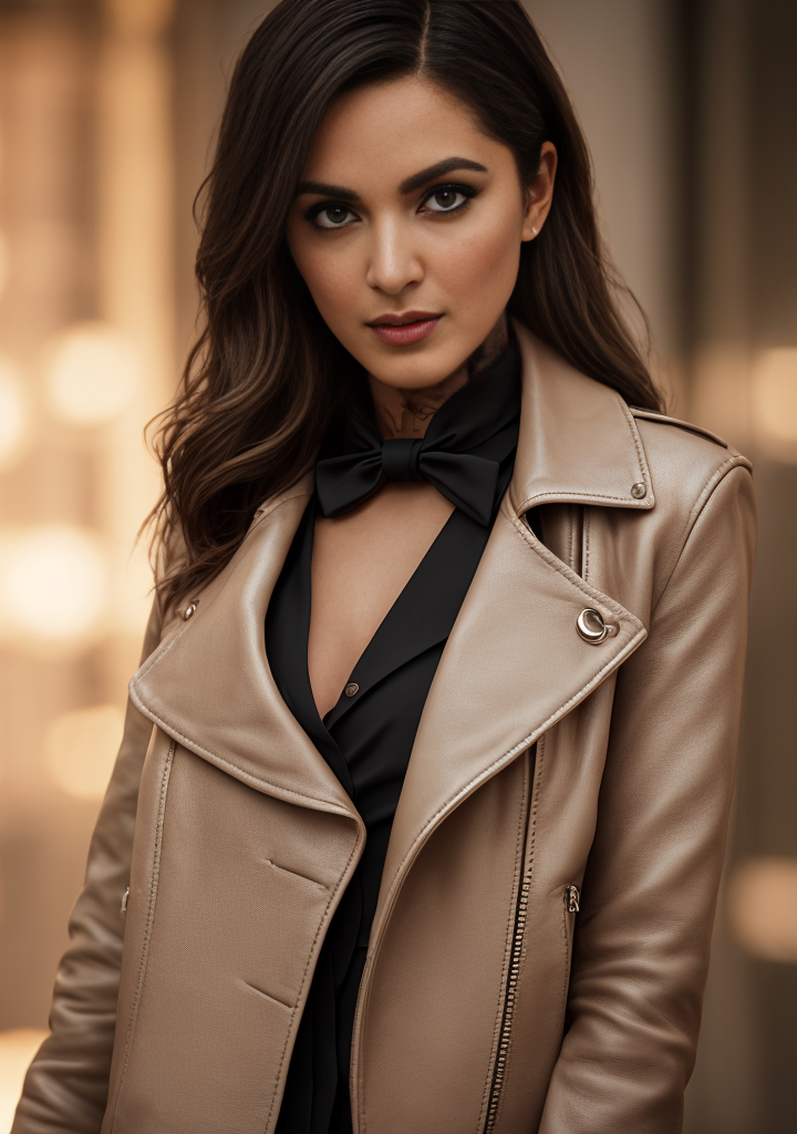 businesswoman, perfect eyes, (high heels), fantastic face, caucasian, beautiful look, Black Leather, jacket, pants, elegant hair, tie, tattoos, (full body visible), looking at the viewer, portrait, photography, detailed skin, realistic, photo-realistic, 8k, highly detailed, full-length frame, High detail RAW color art, piercing, diffused soft lighting, shallow depth of field, sharp focus, hyperrealism, cinematic lighting
