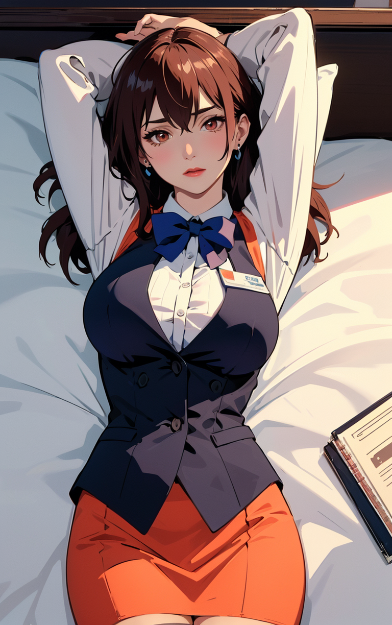 ((masterpiece, best quality)), insaneres, absurdres, solo, looking at viewer, BREAK OrangeSuit_Lingeries_RenaAsaoka_ownwaifu, 1girl, brown hair, red eyes, long hair, lipstick, earrings, makeup, lips, bangs, hair between eyes, large breasts, shiny hair, orange vest, name tag, vest, blue bow, long sleeves, pencil skirt, bowtie, see-through legwear, formal, white shirt, office lady, (dakimakura \(medium\), on back, arms behind head), on bed, pillow, from above, indoors, <lora:FAP_CHR_Lingeries_RenaAsaoka_ownwaifu:0.7> , depth of field ,