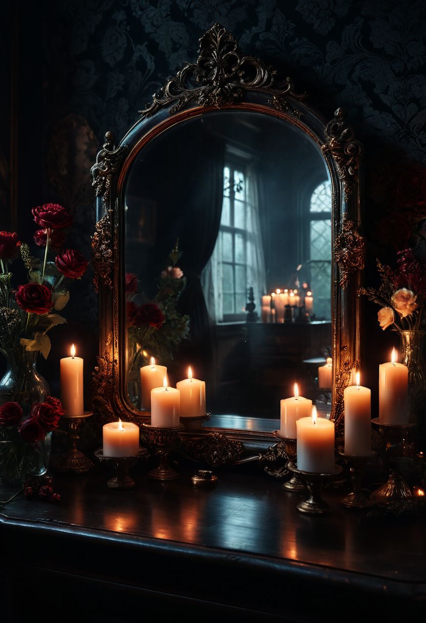 a mirror sitting on top of a table next to a bunch of candles, tumblr, gothic art, dark flowers, victorian vampire art, dark fantasy color scheme, with a mirror, retro vintage and romanticism, dark drapery, dreamy and detailed, cottagecore, rim light style tim burton, dark-art, mirror, dark image,amazing wallpaper, digital painting highly detailed, 8 k hd detailed woman, beautiful art uhd 4 k, focus on mirror, close up, bokeh, unfocused, extremely detailed award winning photography fantasy studio lighting photorealistic very attractive beautiful imperial colors ultra detailed 4k 3d hdr very Dramatic,Dynamic,Cinematic,Sharp details Insane quality. Rembrandt lightning, Insane resolution. Insane details. Masterpiece. 32k resolution. <lora:add-detail-xl:0.95> <lora:dvr-lnds-sdxl:0.3> dvr-lnds-sdxl <lora:MJ52:0.25> <lora:ral-apoctvisn-sdxl:0.3> ral-apoctvisn <lora:zavy-cntrst-sdxl:0.35> dark, chiaroscuro, low-key <lora:zavy-rmlght-sdxl:0.41> zavy-rmlght <lora:SDXLFaeTastic2400:0.225>