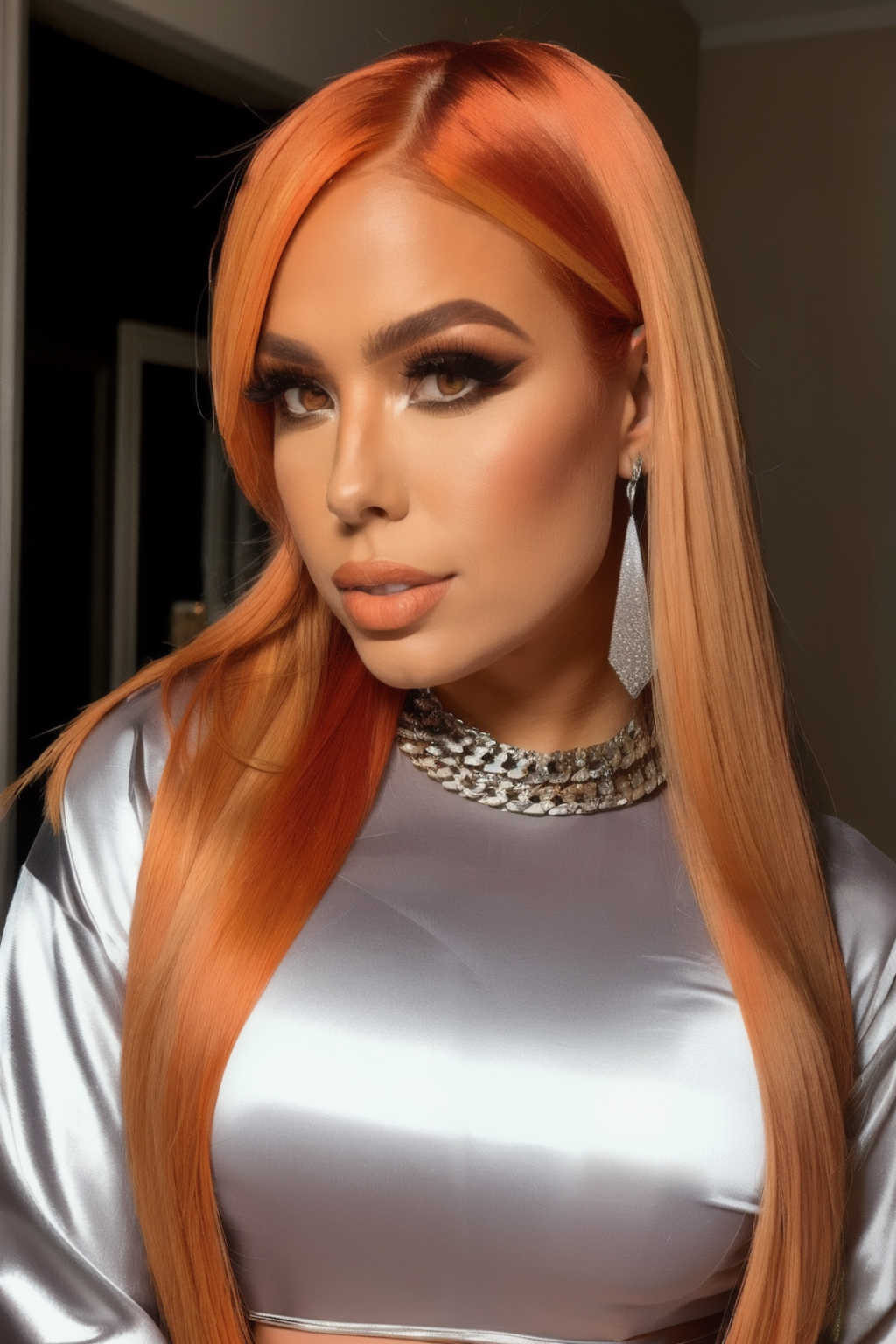 photo of mxd with (amber orange hair), wearing gold chain necklace and silver velvet shirt, <lyco:MaxxineD-RealVision-V1.0:1.0>