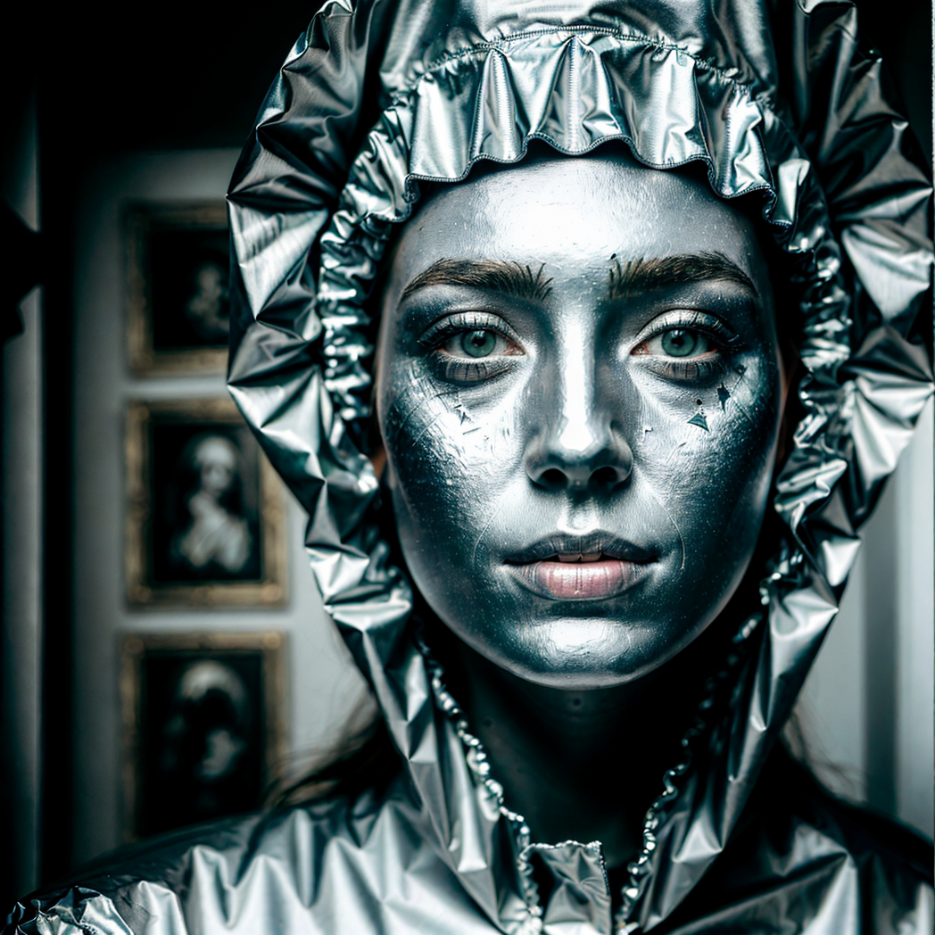 ((best quality)), ((masterpiece)), Portait of a woman wearing a conspiracy weird aluminium foil hat, lower part of the head outside the picture, realistic, canon d40