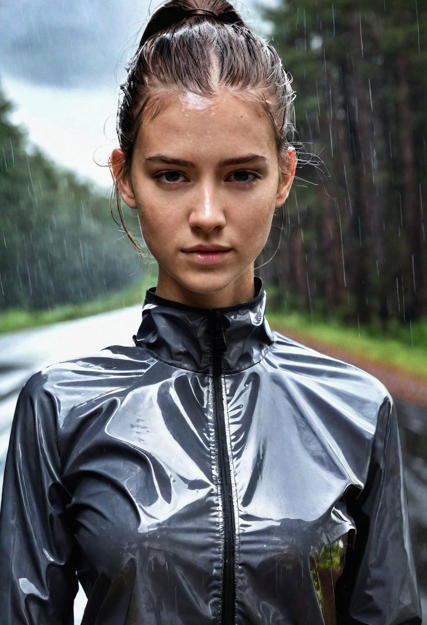 Fashion, professional, asphalt, forest, clouds, rain, close-up, jp-Elle-2325, wetshirt, reflections, looking at viewer, eye contact, shadows, 21-year-old, ponytail, dark hair, mysterious, smirk
