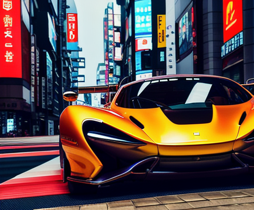 a hover car, racer, made in Japan, flying, sleek, by Ferrari, by McLaren, in Ginza Tokyo, cyberpunk, futuristic, neon, golden hour, dynamic lighting, hdr