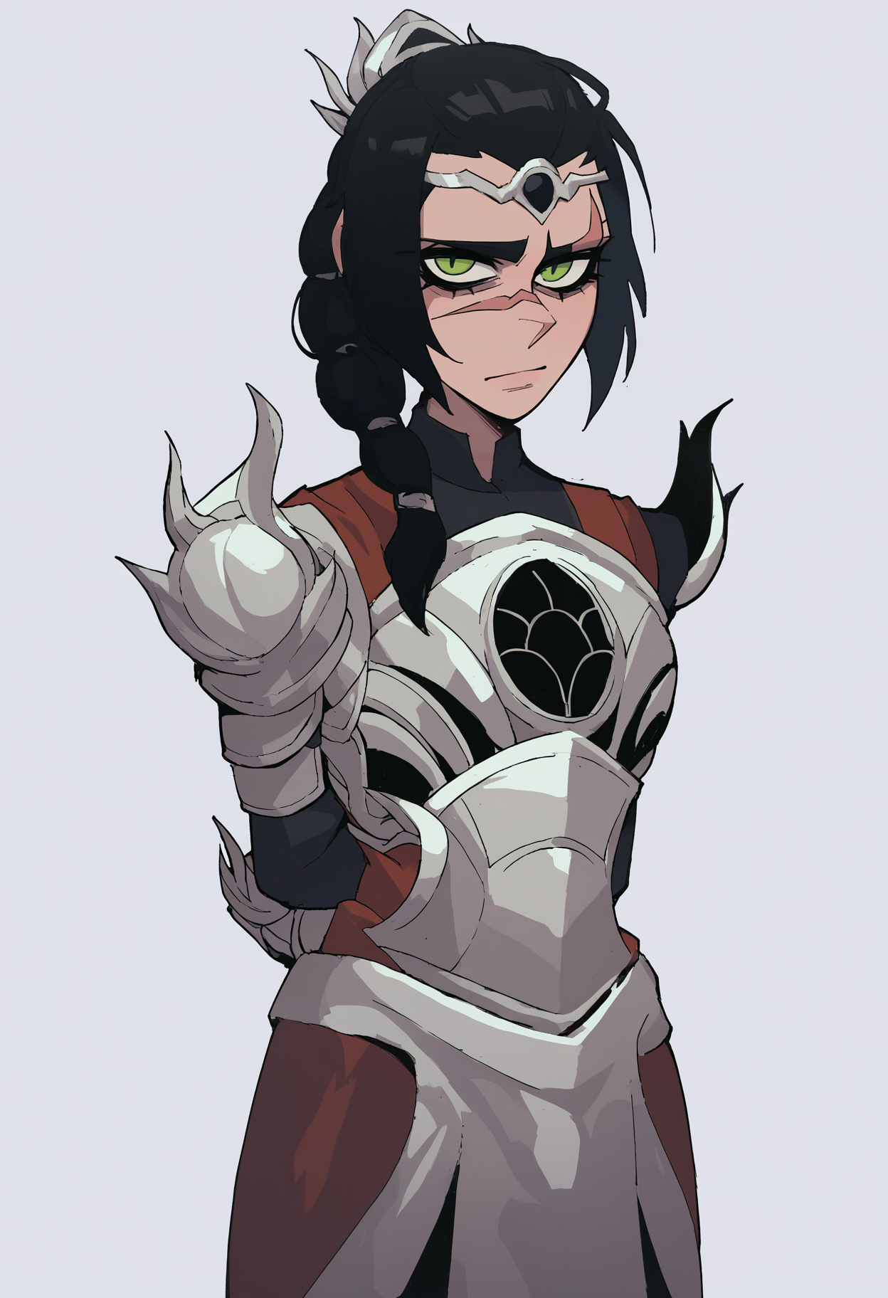 score_9, score_8_up, score_7_up, score_6_up, score_5_up, score_4_up, BREAK, source_anime, 1girl, solo, shadowheart, black hair, braided ponytail, green eyes, scar on face, circlet, looking at viewer, armor, arms behind back, standing, white background <lora:ShadowHeartXL:0.8> <lora:VanripArtXLLocon:1>