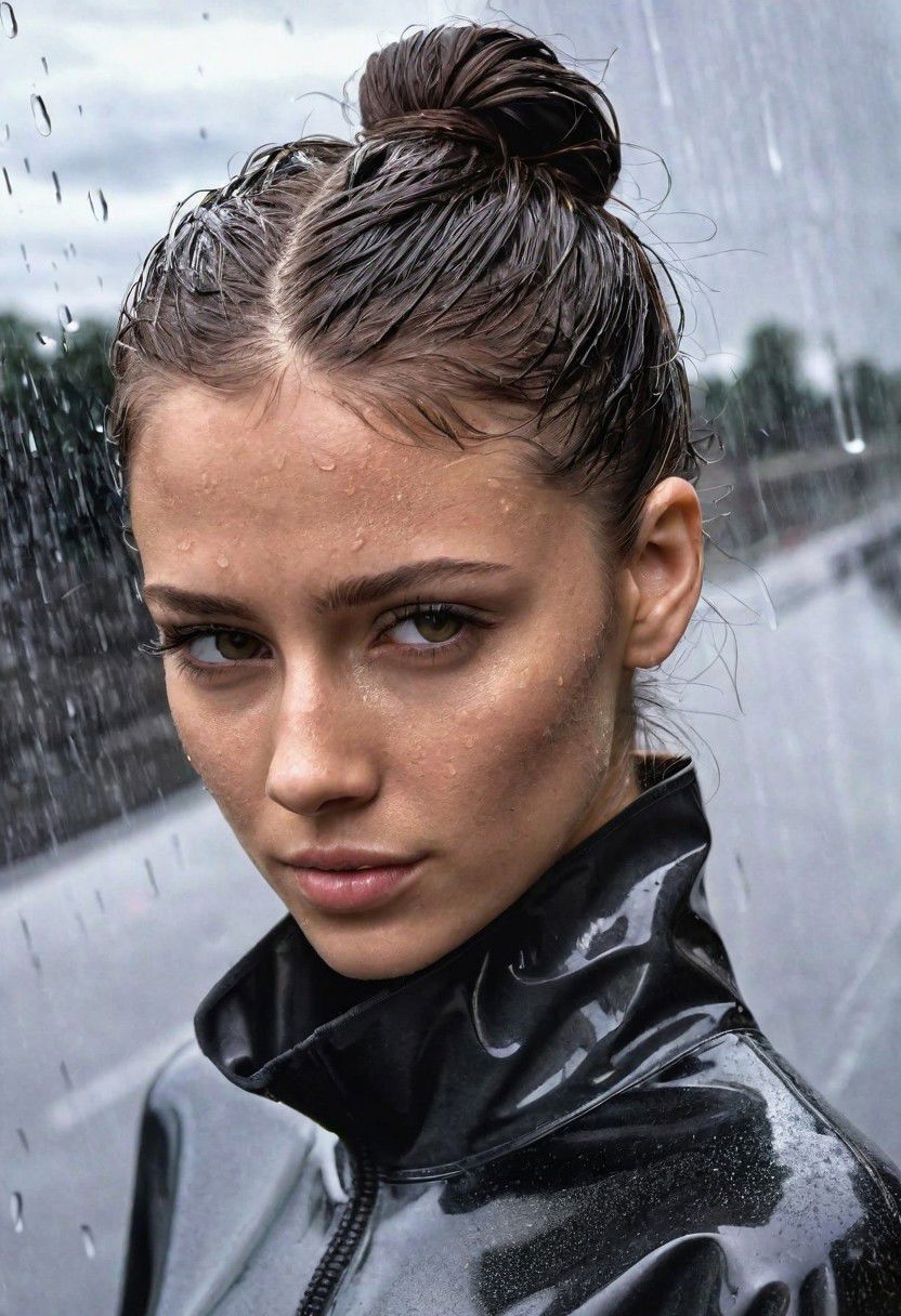 Fashion, professional, asphalt, concrete wall, clouds, rain, close-up, jp-Elle-2325, wetshirt, reflections, looking at viewer, eye contact, shadows, 21-year-old, ponytail, dark hair, mysterious, smirk