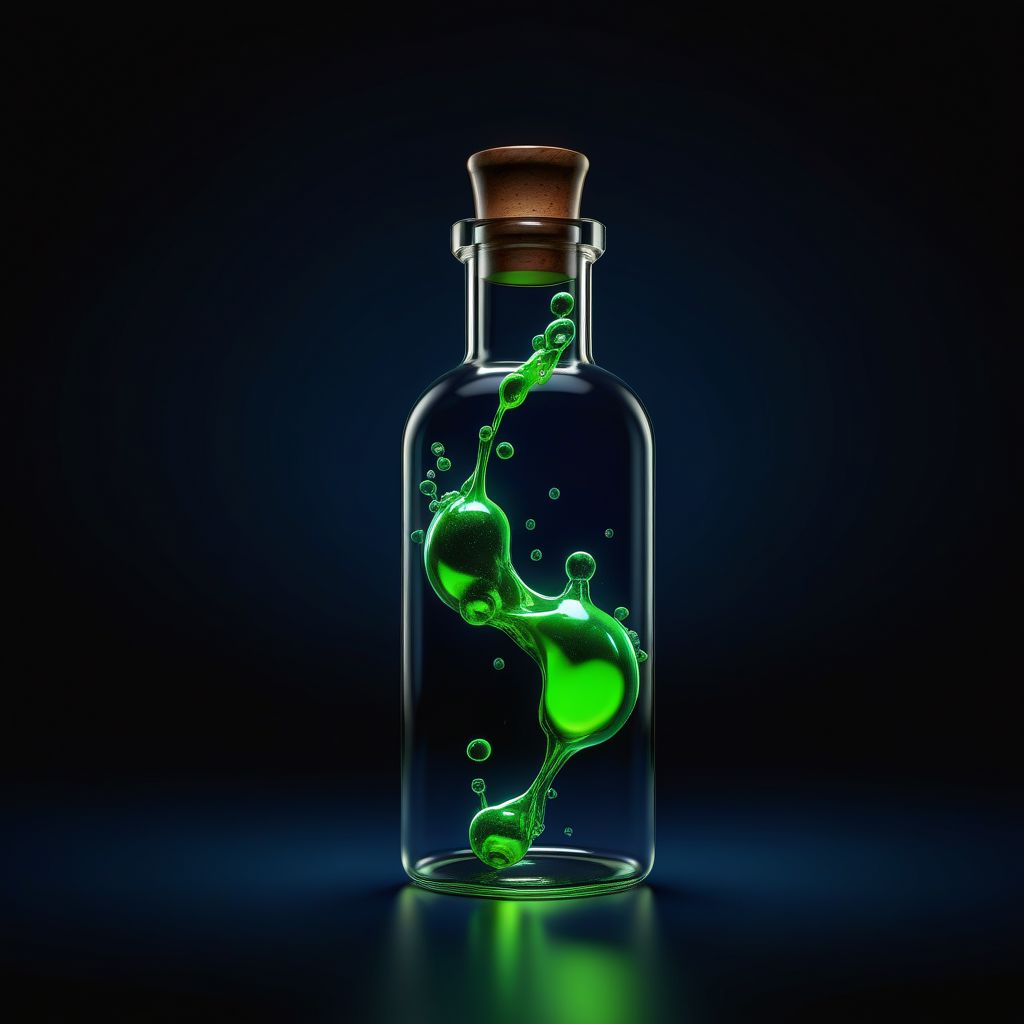 Ultra realistic color pencil image of a vial with a fluorescent green liquid . BREAK Deep dark intense midnight blue smoky background, Dark theme, dynamic lighting, (soft shadows), (soft focus), (photo realistic), uhd, 8k