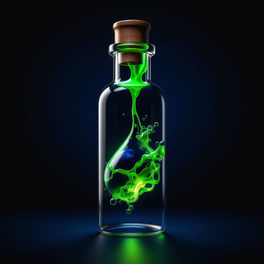 Ultra realistic color pencil image of a vial with a fluorescent green liquid . BREAK Deep dark intense midnight blue smoky background, Dark theme, dynamic lighting, (soft shadows), (soft focus), (photo realistic), uhd, 8k