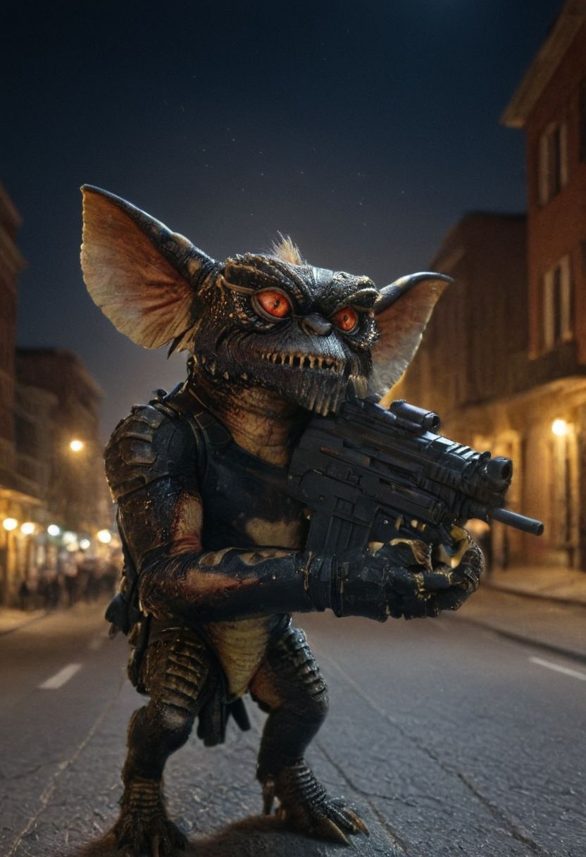 Xgremlinx,(terminator:1.3), sun bases,black chacket, gun, amazing quality, masterpiece, best quality, hyper detailed, ultra detailed, UHD, perfect anatomy, portrait, hyper-realism, majestic, awesome, inspiring, - portrait in night city street , cinematic composition, soft shadows, national geographic style,