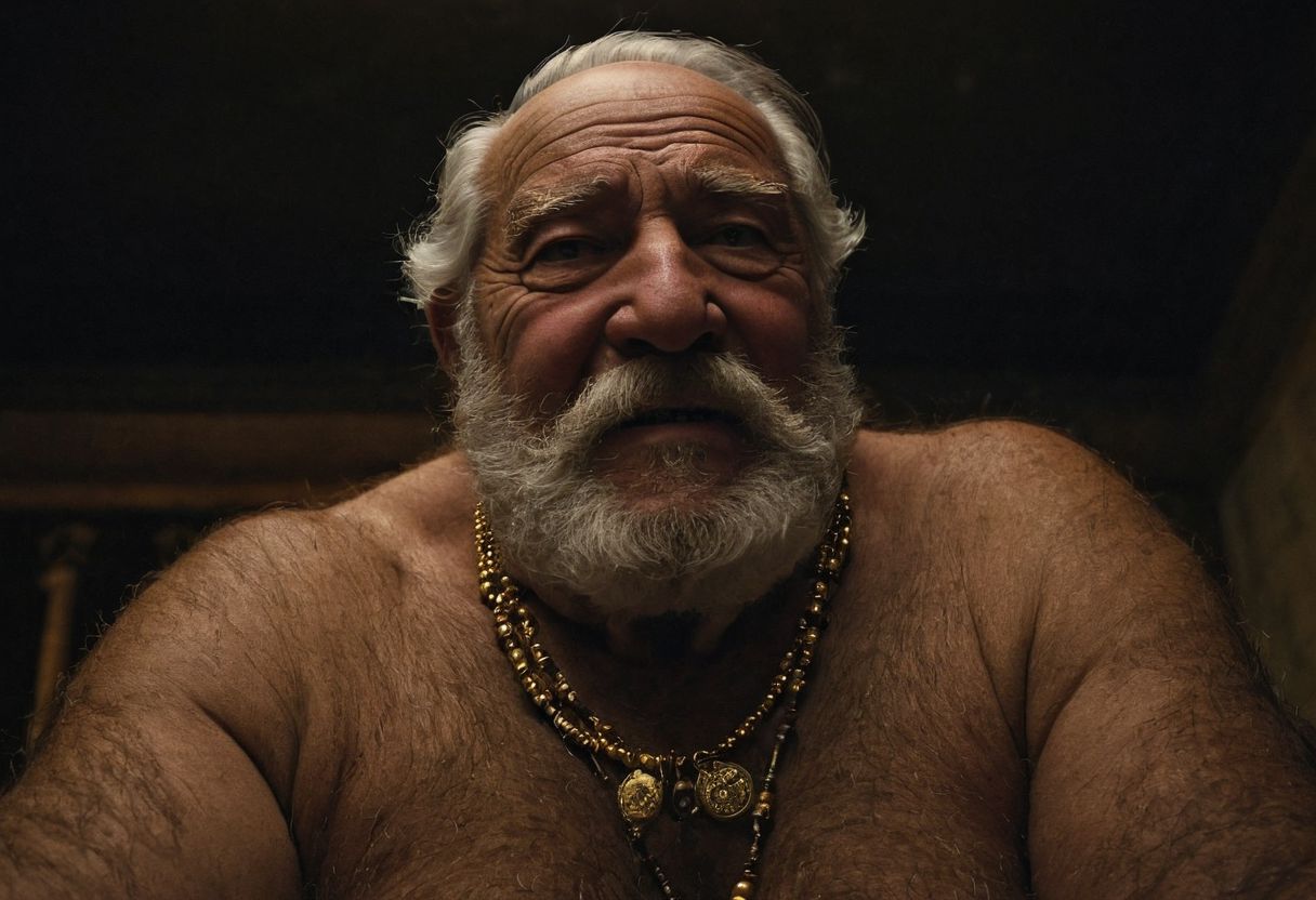 (photo, realistic, raw), (nighttime, at night, dark, dark hard shadows, cinematic atmosphere, movie grain, hazey atmosphere), closeup from below, (priest, european monk, cleric, holy, angelic, wise, gentleman, etherial, spiritual, emperor, king, god), old burly buff hairy gentleman, old manly hairy mature man, combed back hair, doublechin, old tanned grandpa, wrinkly neck, proud big hairy chest, thick neck, armpits, tanned skin, tight golden spandex, gold jewellery, gold necklace, in a dark cloister bedroom at night, nighttime,looking directly at viewer with a loving caring smile, leaning forward close to viewer, very close, intimite situation, romantic atmosphere, intimate lustful romantic expression, sad expression, belly and pecs from below