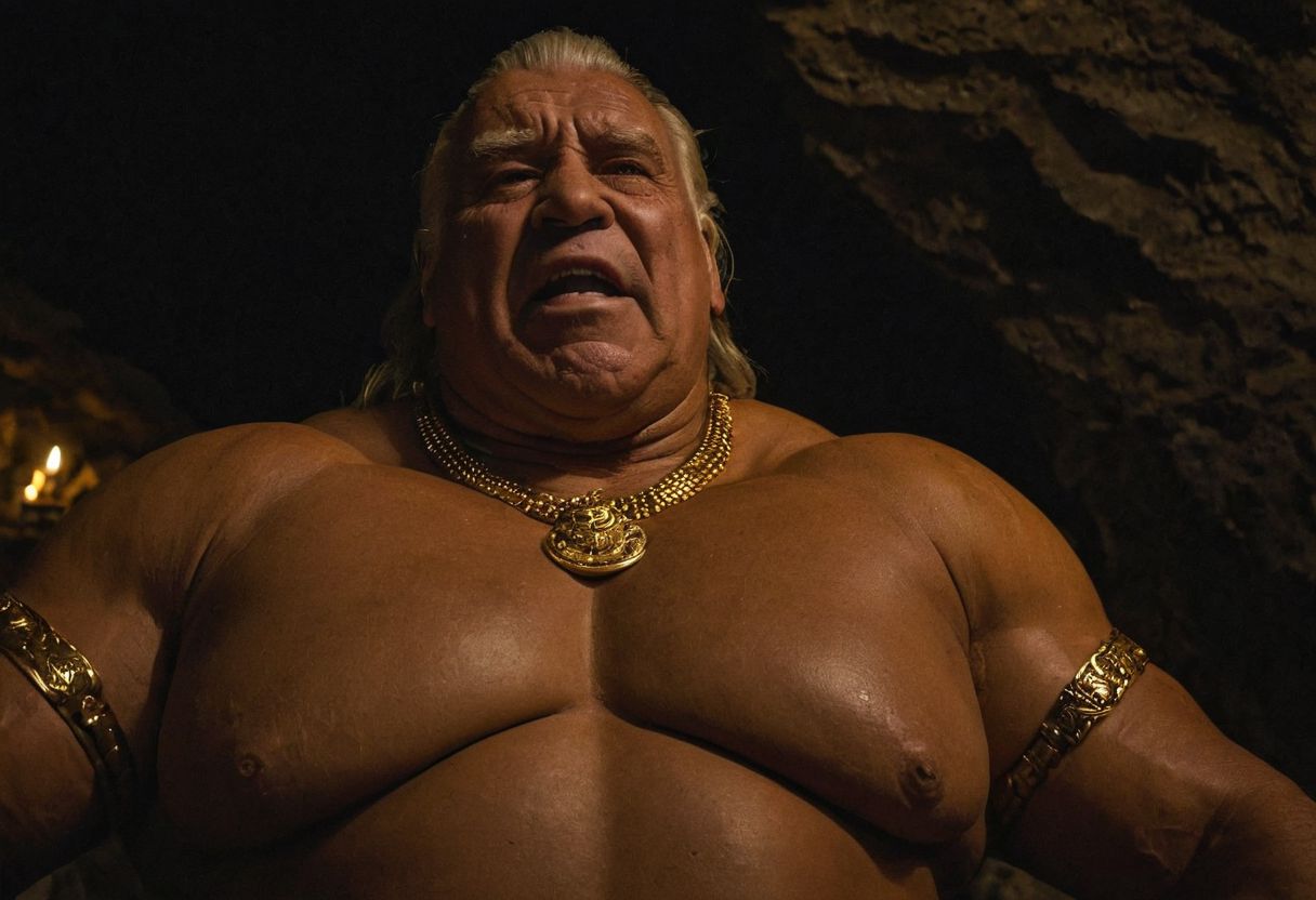 (photo, realistic, raw), (nighttime, at night, dark, dark hard shadows, cinematic atmosphere, movie grain, hazey atmosphere), closeup from below, (brute, barbarian, etherial, spiritual, emperor, king, god), old burly buff gentleman, old manly mature man, combed back hair, doublechin, old tanned grandpa, wrinkly neck, proud big chest, thick neck, armpits, tanned skin, tight golden spandex, gold jewellery, gold necklace,gold earring, tribal tattoos, in a dark ancient cave at night, nighttime,looking directly at viewer with a loving caring smile, leaning forward close to viewer, very close, intimite situation, romantic atmosphere, intimate lustful romantic expression, sad expression, belly and pecs from below