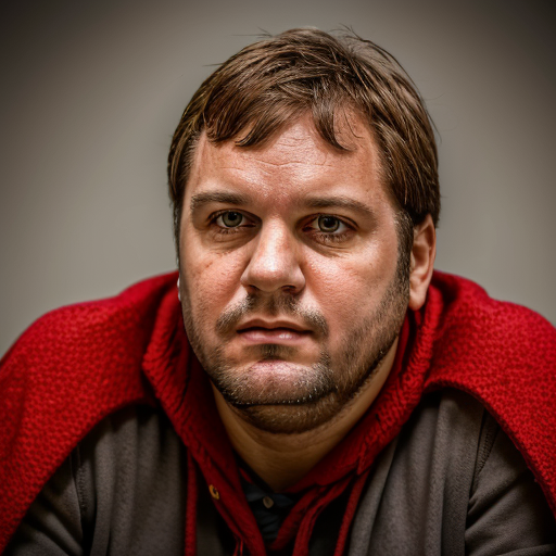 1boy, man, solo, jchk, portrait, looking at the viewer, red cape, male focus,( stubble:1.2), chubby, focus on face, close up, <lora:Jean-Christophe_Hembert_-_Karadoc_Kaamelott:1>