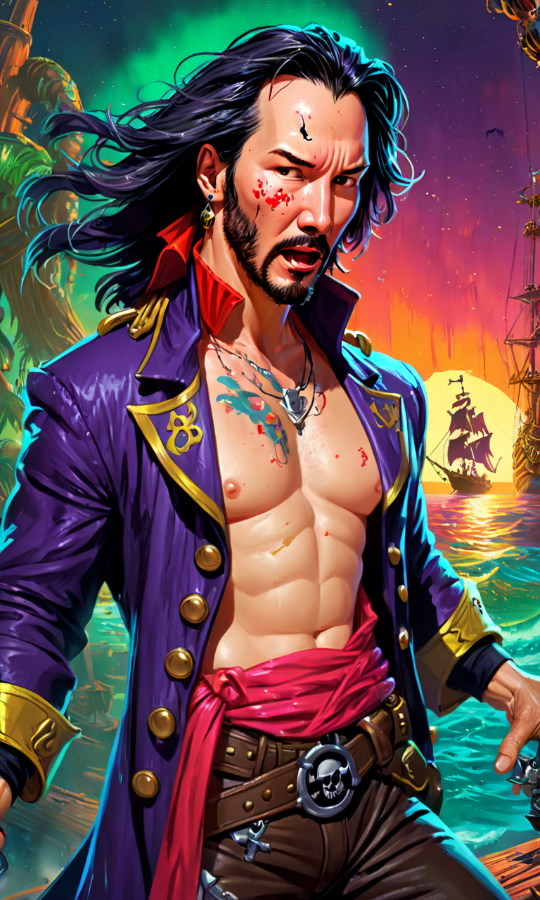 vaporwave style Logo ethereal fantasy concept art of (Disney style:1.5) ((Keanu Reeves face:1.4)) (Death's Head Island:1.3), style by Bruce Pennington,(Linnea Strid:1.3),_background_,(_pirate old wood ship_:1.7)There are a lot of monsters and dead drowned people around from the movie Pirates of the Caribbean, style by Bruce Pennington,(Linnea Strid:1.3), the style of pirates of the Caribbean, Dark Red clothes, Angry,face tatoo, body tatoo,head tatoo, weapens, wide open green eyes, rough boots on your feet, shooting Bnd explosions all around a dark background, rides a Harley, Stardust,(Wind:1.2), black cloak, Orange Blood, ((very bright light on the face1.5)),best-quality,infinitely detailed,dynamic-angle,deep-night-colors,ultrarealistic naughty deviant,playful-shadows,good-mod,black-hair,perfect-face,, amazin, theatrical, stunning, sublime, extremely beautiful, very delicate, passionate, highly intricate, magical ambient, sharp focus, dramatic, epic breathtaking, divine, glowing, illuminated, cinematic, incredible, phenomenal, pure, astonishing, creative, amazing, inspiring, thought, rich, marvelous, wonderful, awesome, splendid, brilliant . retro aesthetic, cyberpunk, vibrant, neon colors, vintage 80s and 90s style, highly detailed