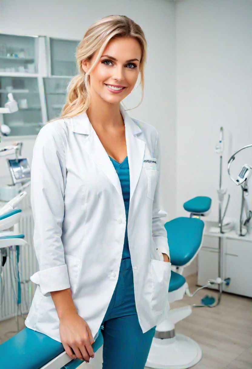 photo full-body portrait of a cute german woman \Stefanie Hinze\ as a dentist, deep cleavage (grainy:0.7)