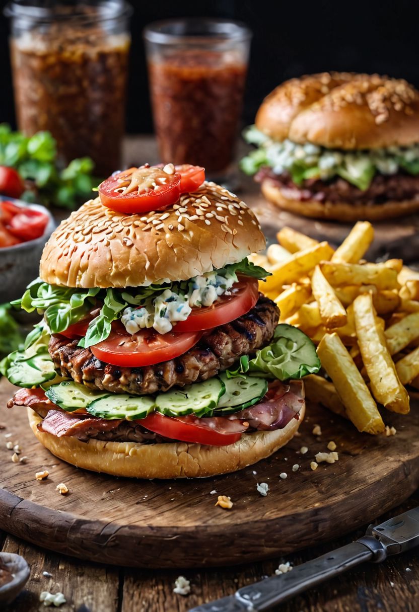 RAW photo, hamburger, a homemade hamburger with a juicy steak, a golden bun with cereals, salad, blue cheese, a large slice of tomato, cucumbers, bacon and accompanied with fries, food photo, DSLR, very colorful, high quality, film grain, very detailed, intricate details, Fujifilm XT