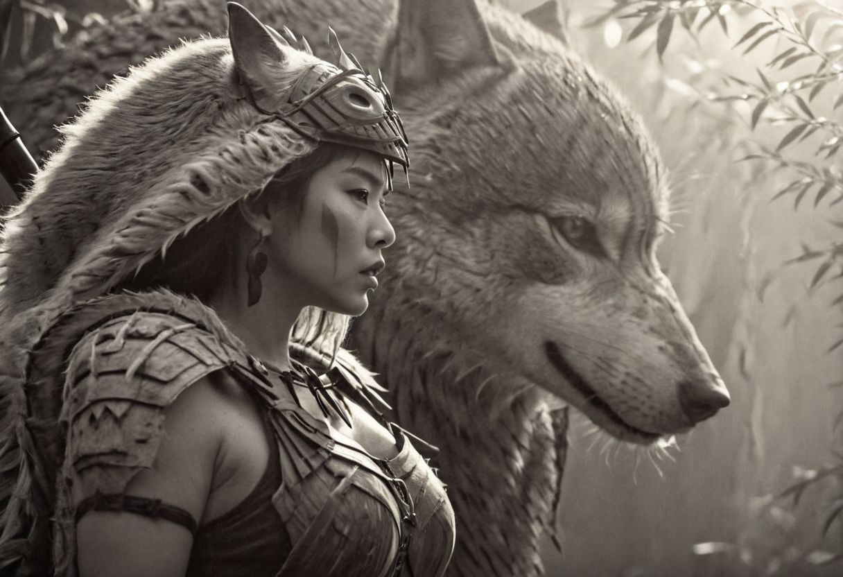 Monochrome, Into-darkness, side view, a busty female warrior in bamboo armor standing infront of wolf, closeup, extrem volumetric lighting backdrop, atmospheric haze, Film grain, cinematic film still, shallow depth of field, highly detailed, high budget, cinemascope, moody, epic,