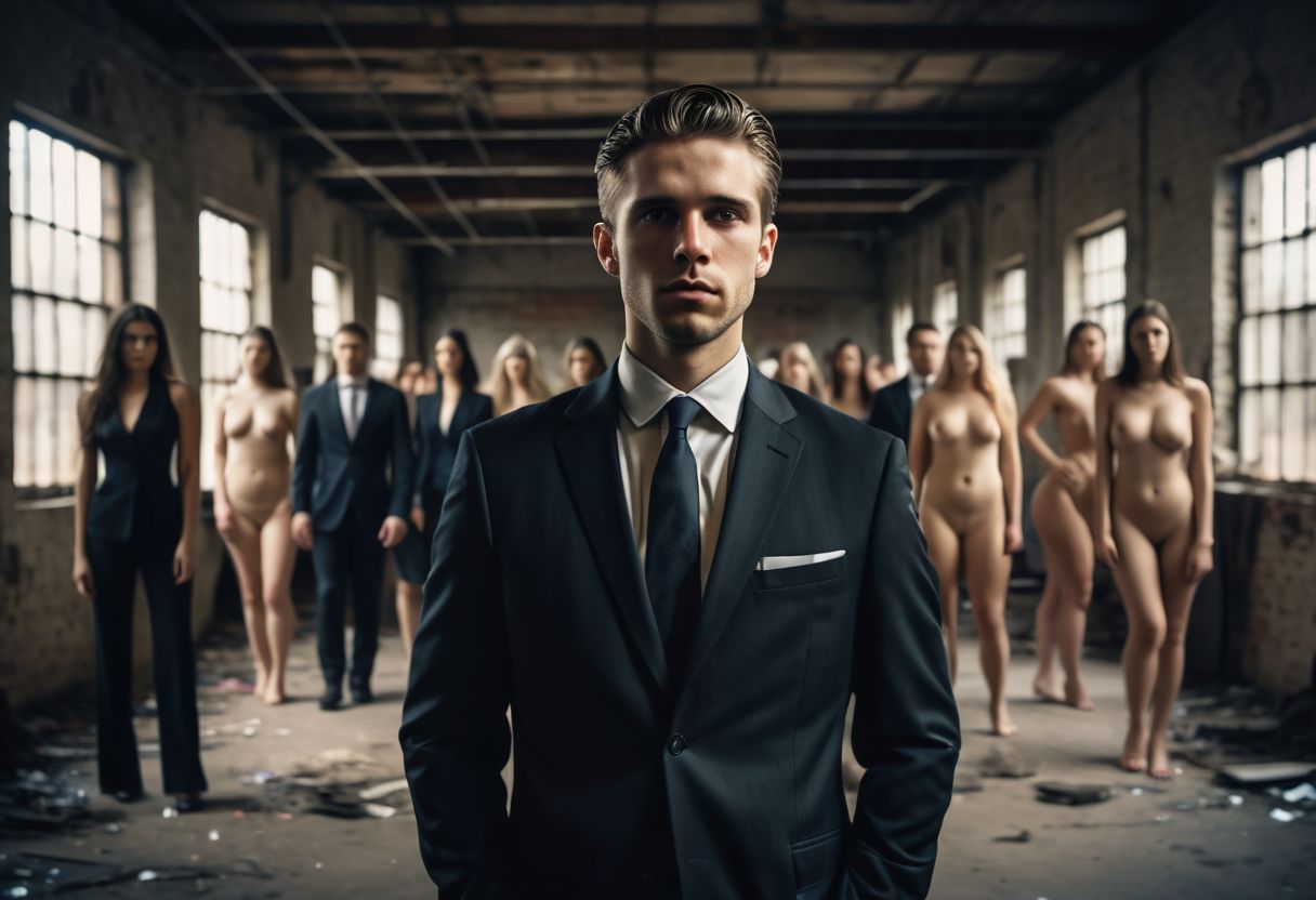Surreal art print photograph. Abandoned warehouse space with dark surreal lighting. A man in a business suit stands in the midground. His face is an indistinguishable blur but his body is shalt on focus. Bokeh effect, man in suit in focus. He is surrounded by beautiful nude women. They stand with hands behind backs submissively. All are beautiful and realistic.