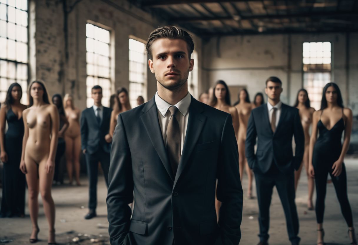 Surreal art print photograph. Abandoned warehouse space with dark surreal lighting. A man in a business suit stands in the midground. His face is an indistinguishable blur but his body is shalt on focus. Bokeh effect, man in suit in focus. He is surrounded by beautiful nude women. They stand with hands behind backs submissively. All are beautiful and realistic.