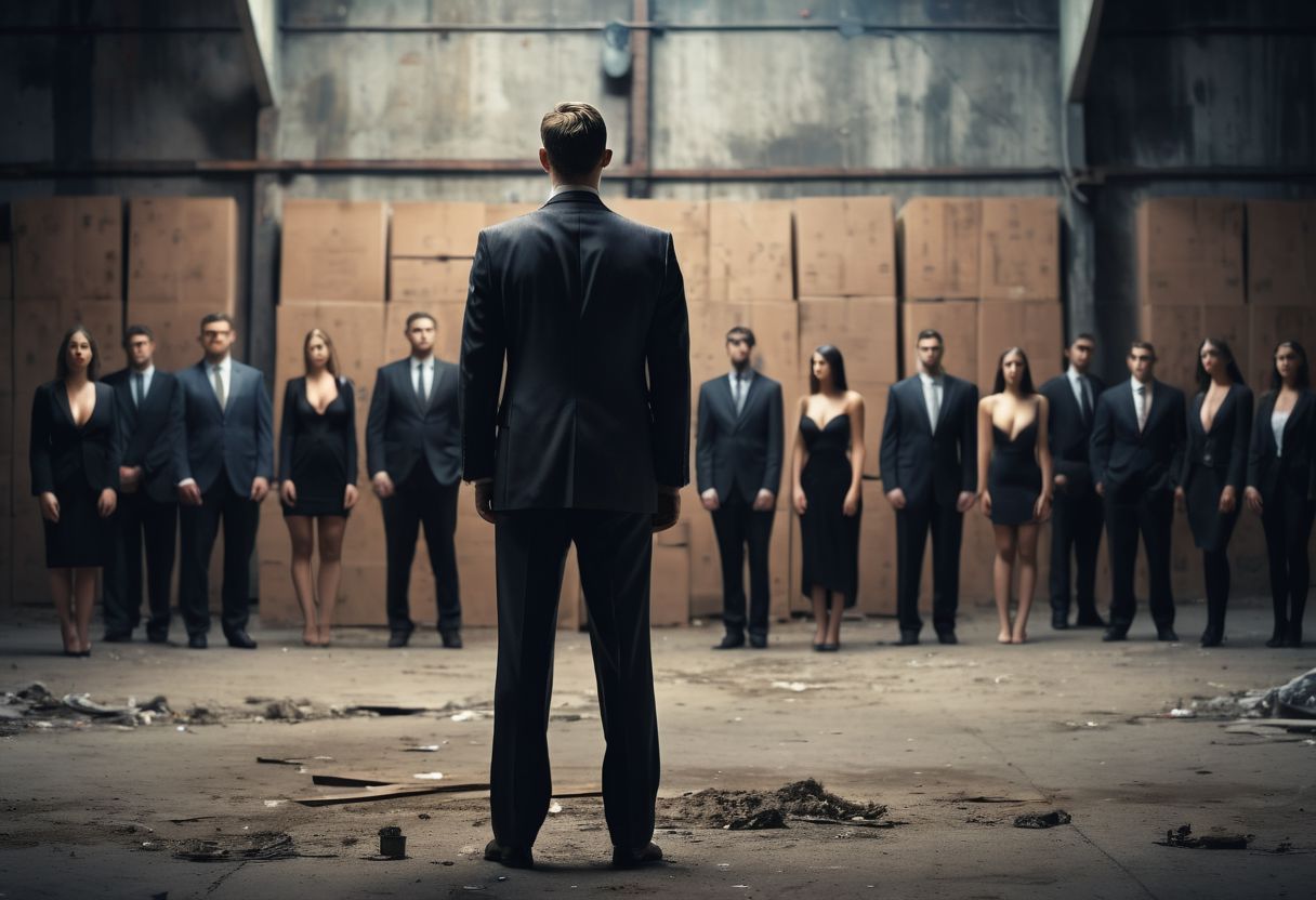 Surreal art print photograph. Abandoned warehouse space with dark surreal lighting. A man in a business suit stands in the midground. His face is an indistinguishable blur but his body is shalt on focus. Bokeh effect, man in suit in focus. He is surrounded by beautiful nude women. They stand with hands behind backs submissively. All are beautiful and realistic.