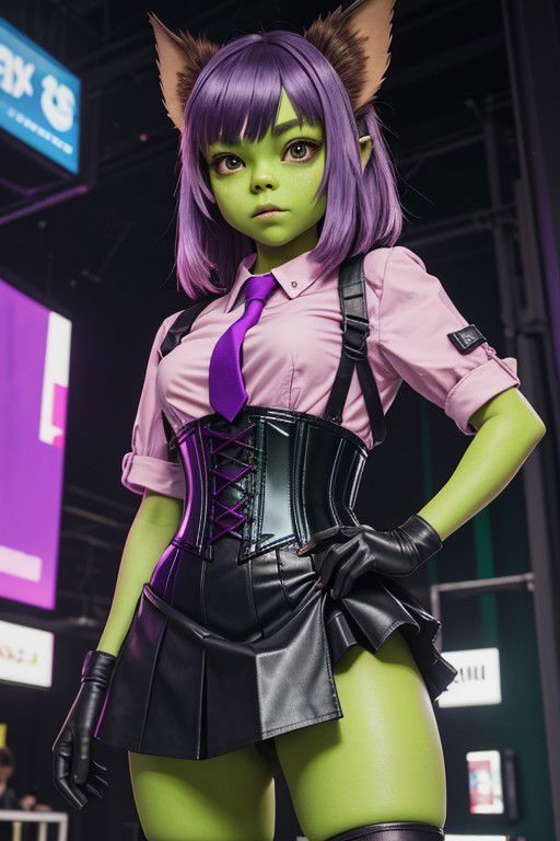 cute gremlin girl with green skin, owler style, realistic, brown eyes, realistic, standing, cherrmous style, closeup, corset, leather skirt, pink shirt, cyberpunk city at background, purple hair, ([ivy lebelle|violet starr|ivy lebelle]:0.9), 21 year old, , alluring, attractive, amazing photograph, masterpiece, best quality, highres, <lora:gremlin_girl_1:0.85> cute gremlin girl with green skin, caught naked pose wearing a pornpics-com style g-string micro bikini, _gtll_