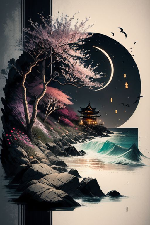<lora:Calligraphy-ink-style-darquelilly-v1:1> calligraphyinkstyle, Asian wishing lanterns in the night sky, cherry blossom trees, a beach by the sea, volumetric lighting, night time, moonlight rfelected in the water, black background, peacful atmosphere