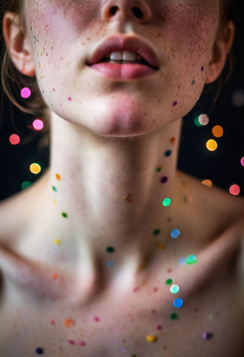 Supremely Intimate Photograph of a young woman's throat, delicate collarbone, shoulder and breast in Saturated studio lighting. Strong Bokeh effect. A stunning and interesting petite young perky chest, she is of Irish heritage with pale skin and just a few light freckles. Her breast has thousands of colorful nonpareil candy dots stuck around her puffy nipple. deeply aroused and aching for sexual release, the yearning. Extreme Bokeh effect, colorful nonpareils on breast in focus, everything closer and farther are out of focus. Black negative space
