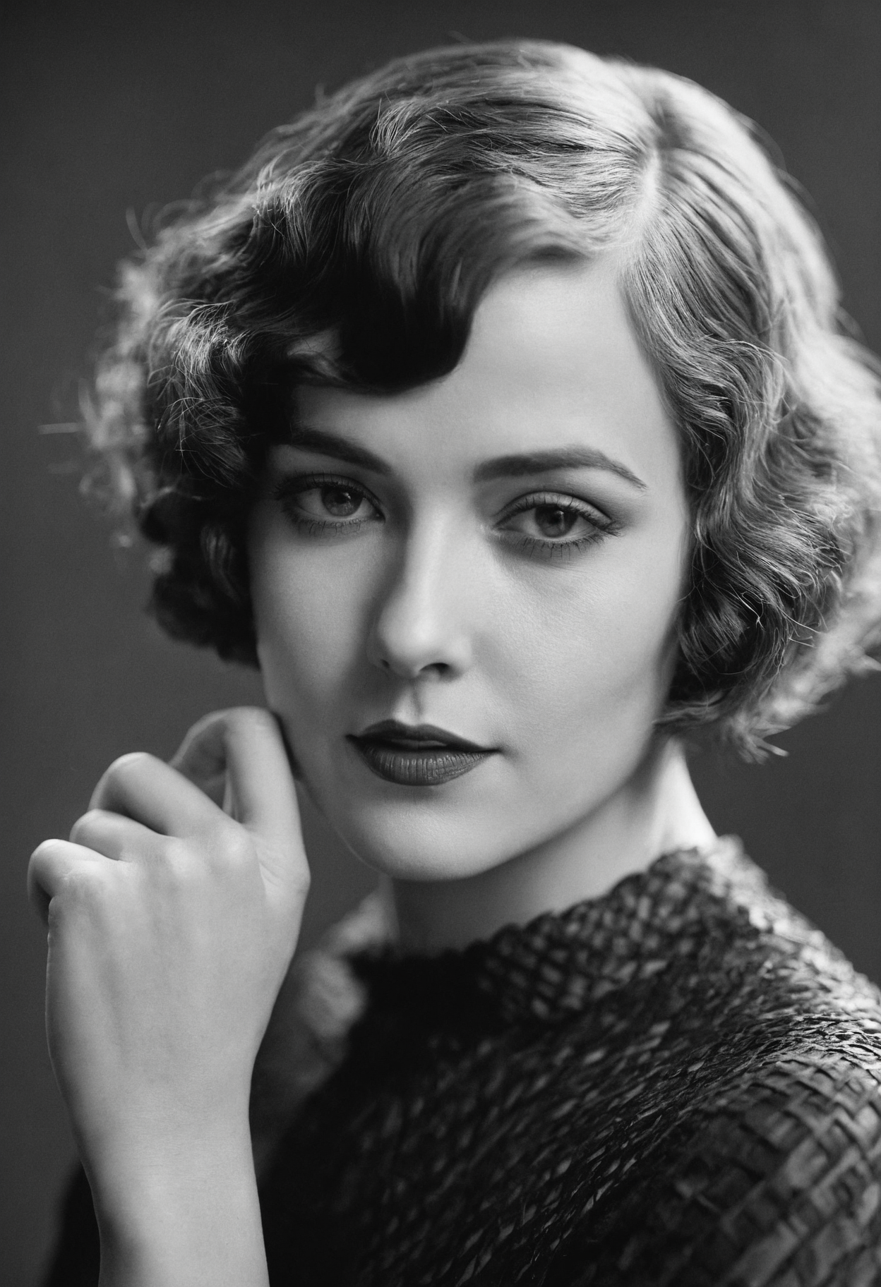 Photograph of a woman from the 1920s, short hair, (finger-weave hairstyle:1.1),posing for a photograph. close-up, black and white, cinematic composition, looking at camera, seductive, soft shadows, grainy,