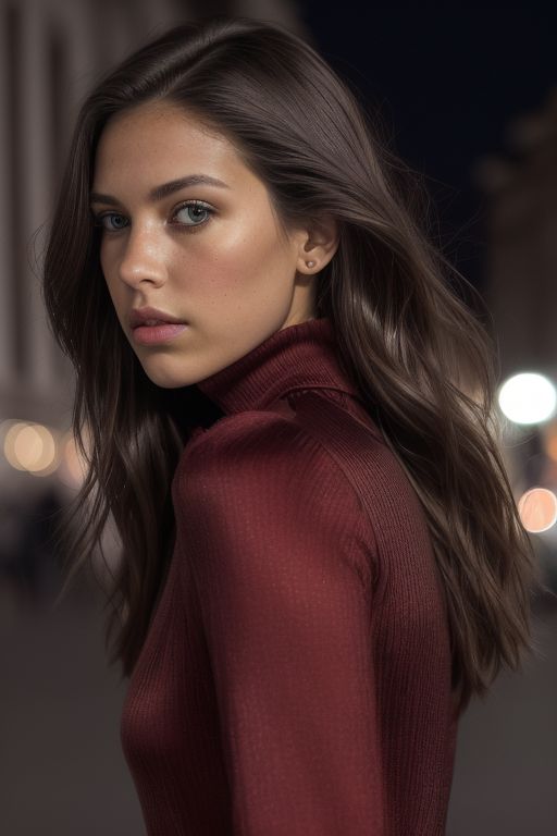 a portrait shot of a beautiful 30yo girl,walking in rome at night, realistic green eyes, dark red elegant dress, cleavage, fuji x3, 4k pores, detailed skin, perfect eyes