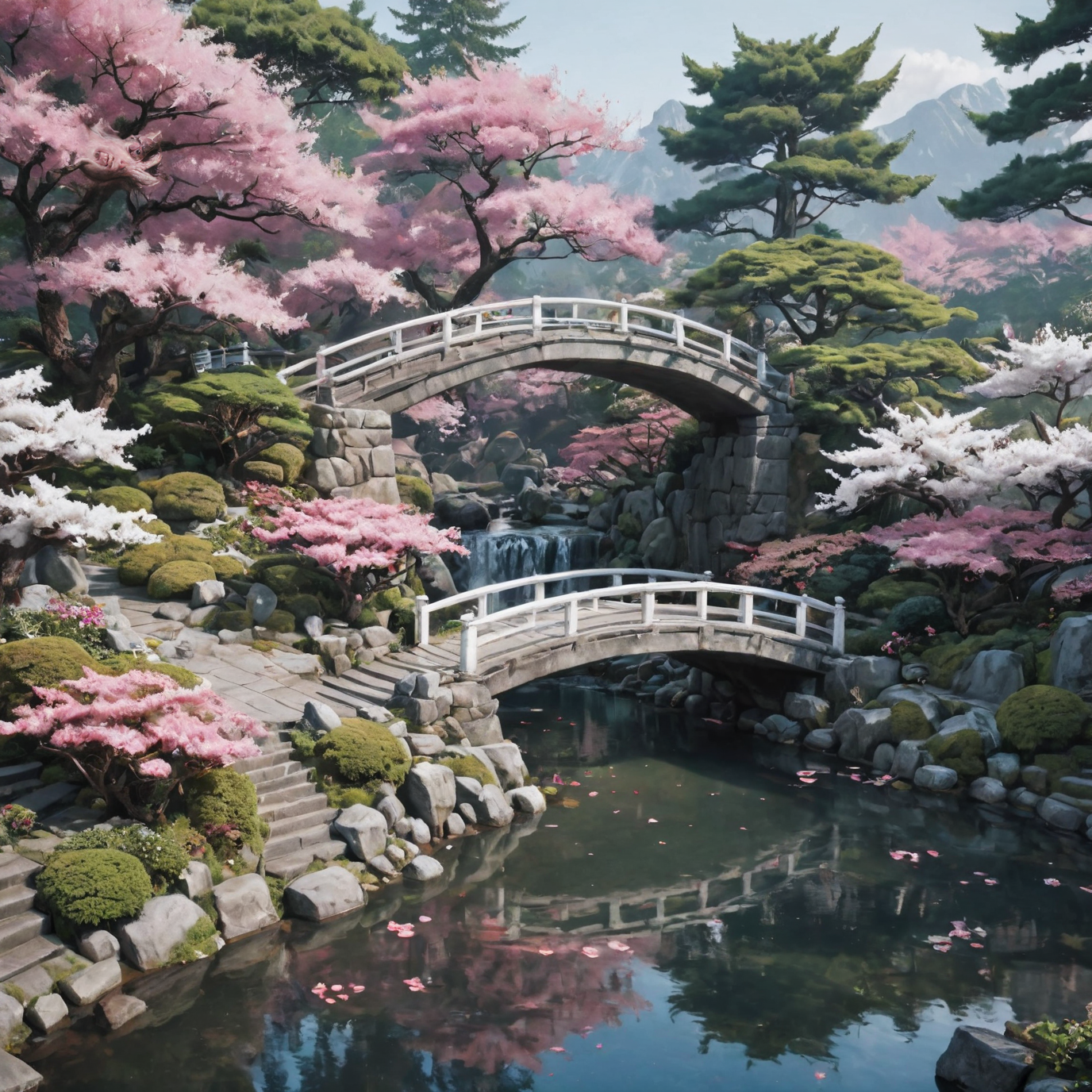 long range view, Beautiful Japanese flower garden, elegant bridges, waterfalls, pink and white, by Akihito Yoshida, Ismail Inceoglu, Karol Bak, Airbrush, Dramatic, Panorama, Cool Color Palette, Megapixel, Lumen Reflections, insanely detailed and intricate, hypermaximalist, elegant, ornate, hyper realistic, super detailed, unreal engine